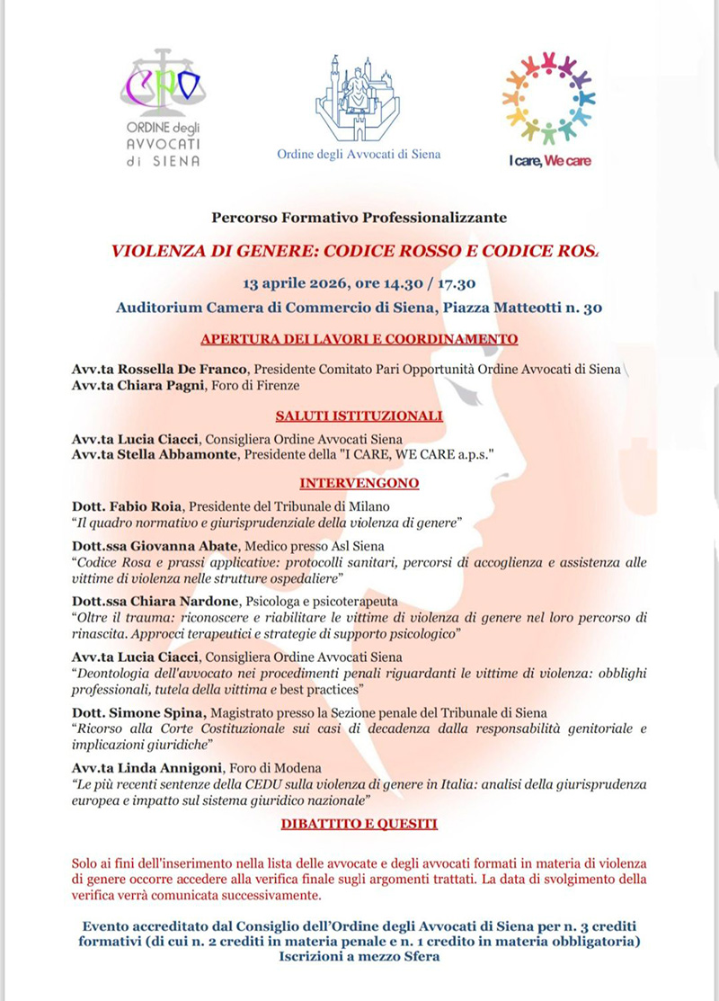 L’evento è stato organizzato dal Comitato Pari Opportunità degli Avvocati di Siena, dall’Ordine degli Avvocati di Siena e dall’Associazione I Care We Care Aps. La sessione rientra in un percorso formativo volto all’inserimento dei professionisti nella lista degli avvocati formati specificamente in materia di violenza di genere.